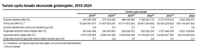 Türkiye'de doğrudan turizm amaçlı gayrisafi katma değer 2024 yılında 2 trilyon 21 milyar 129 milyon 805 bin TL olarak gerçekleşti. Doğrudan turizm amaçlı gayrisafi katma değerin toplam gayrisafi katma değer içerisindeki payı yüzde 5,1 oldu.